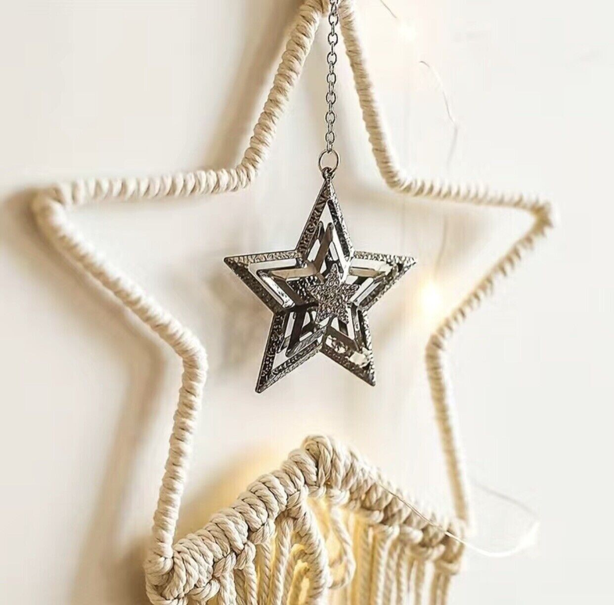 Doppelter Stern Makramee Hell Beige, Traumfänger Boho Wandbehang, Weihnachten