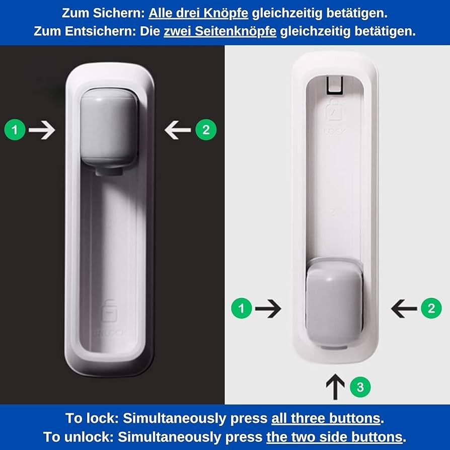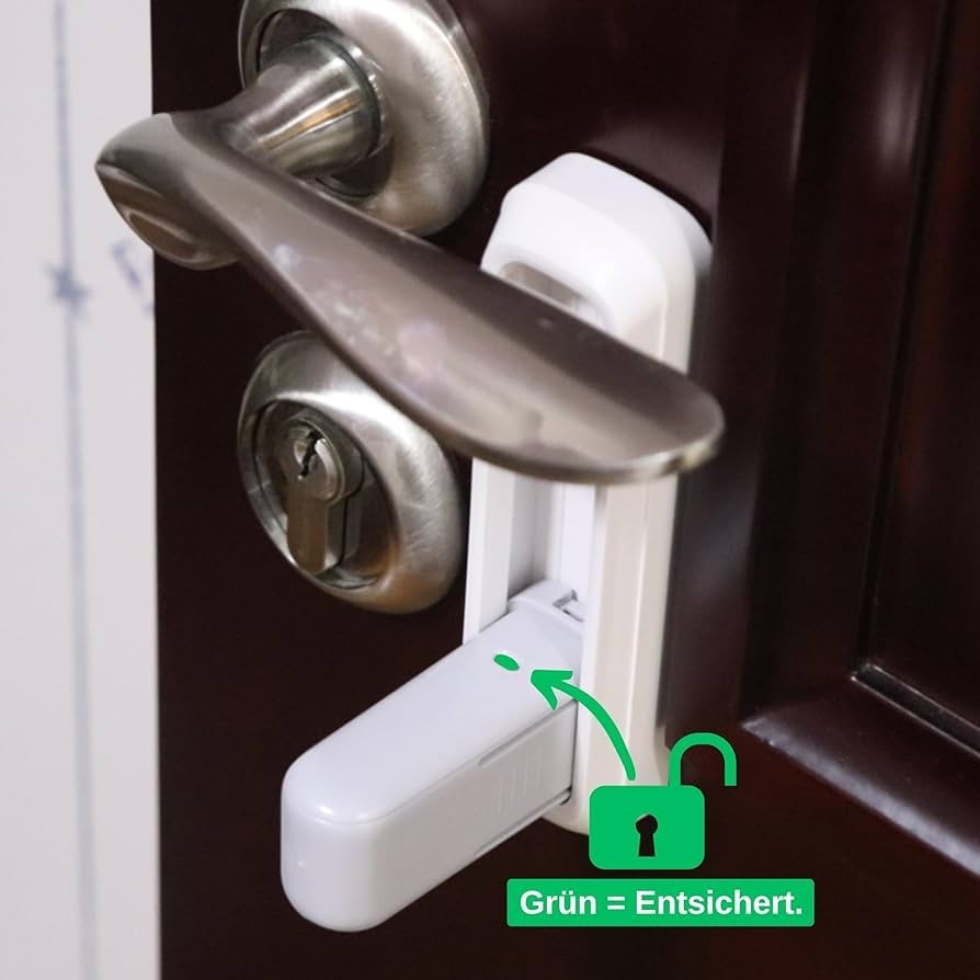 Türdrückerschloss zum Kleben, 2 Stück, wieder-verwendbar, mit 3-Druck-Knopf-System, für Kinder und Haustiere, Kindersicherung für Haustüren, Tür Babysicherung, Türgriff Sicherung, Türklinken Schutz